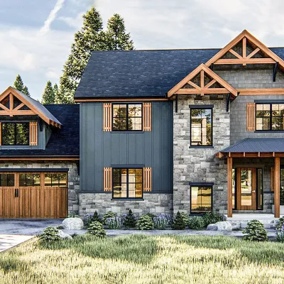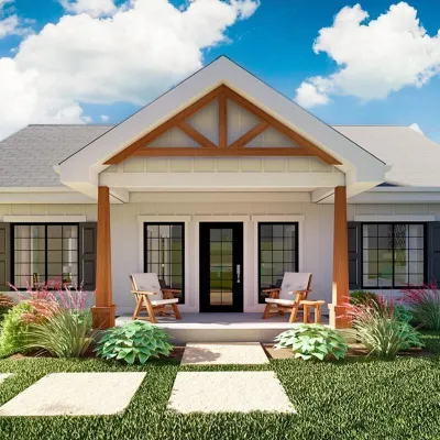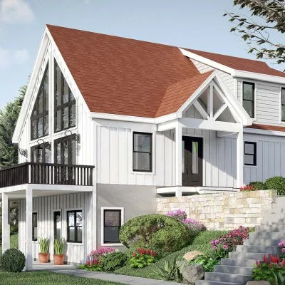 Mirror reverseThis plan will accurately fill all the items in the wishlist if you are looking for a country-style house. A mixture of painted brick cladding, facade panels, siding and a combination of gable roofs will make this home warm and inviting with a touch of everyday life. In the center of the house is a cozy living room with a vaulted ceiling and fitted wardrobes around the fireplace. An open kitchen with an island gathering around friends, and a dining room suitable for banquets.