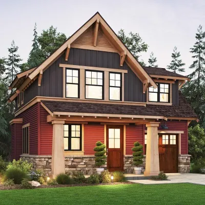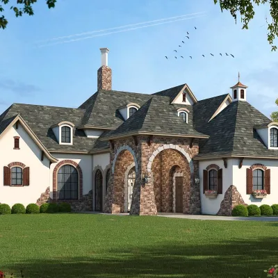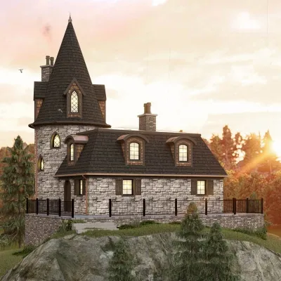 План коттеджа в сказочном стиле с красивой крышей и круглой трубой DR-21504-2-3