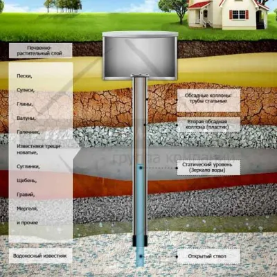 Недостатков фильтровой скважины лишена скважина артезианская. Первоначально так называли глубинные самоизливающиеся скважины (из которых вода поступает на поверхность под напором водоносного слоя). Однако сегодня артезианской считают любую скважину, пробуренную «на известняк» - в этом случае водоносный слой представляет собой уже не осадочную, а сильнотрещиноватую скальную породу, имеющую тонкозернистую структуру. Глубина такой скважины может варьироваться от 30 до 300 метров, а значит и затраты (времени и ресурсов) на ее сооружение в общем случае будут гораздо выше. Однако это тот случай, когда овчинка стоит выделки: