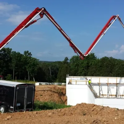 Concrete is typically placed in ICF walls using a boom-type concrete pump. Line-pumps or even conveyor belt equipment can be used too. Specified compressive strength used in ICF walls can be whatever is required to resist structural loading. The most common is a 3000 psi (21MPa) or 4000 psi (27.6 MPa) concrete pump mix. The recommended largest aggregate size should be ½-inch for 4- and 6-inch cavity forms and ¾-inch for 8-inch and larger cavity forms. The required concrete slump is 6 inches. To accommodate pumping using high-range plasticizers and mid-range water, the slump could be up to 8 inches or more.