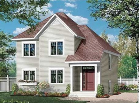 This Tudor house has front porch arches, bay window, gable window and faced with stucco. A steeply pitched roof with several gable peaks completes the look of this house. Designed for…