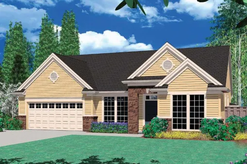 This home suited for a corner lot due to a side entry garage. House facade has bay windows and stucco walls. A complex roof with large front-facing gables completes the look of this house. House…