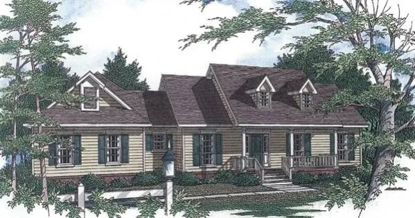 This house facade has front porch arches, shuttered windows and faced with horizontal siding. Clipped rooflines with several gable peaks complete the look of this house. House plan is 52 feet wide by…