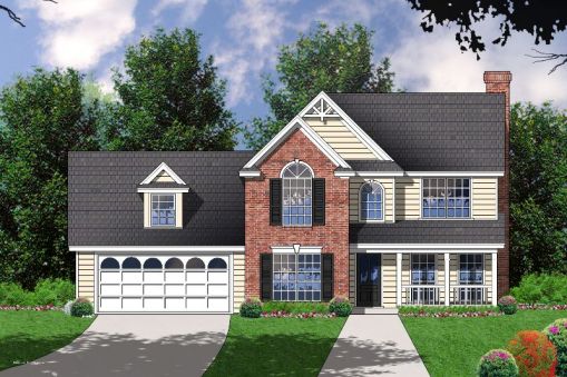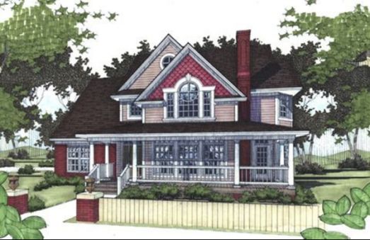 This romantic single-story French house plan with two-car garage is faced with brick. Arched garage doors and a window with shutters on the gable, as well as a veranda in front of the entrance…