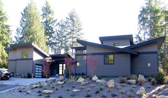 Recommended materials: With a large roof slope, a waterproofing membrane may not be used. To give a dynamic look, use a sheet of roof covering (for example, metal) and not tile or shingles. To get the effect of a passive house, use solar panels and collectors.