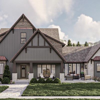 Проект дома в английском стиле с каменным фасадом и красивой асимметричной крышей