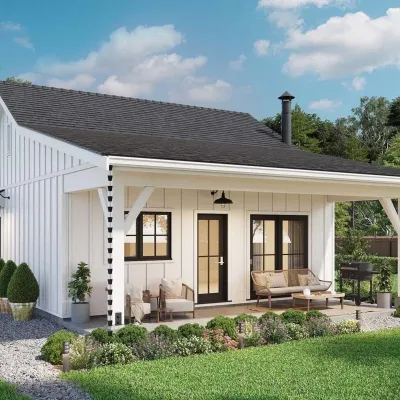 Открытое жилое пространство включает в себя крытый вход и просторный задний двор с крыльцом.