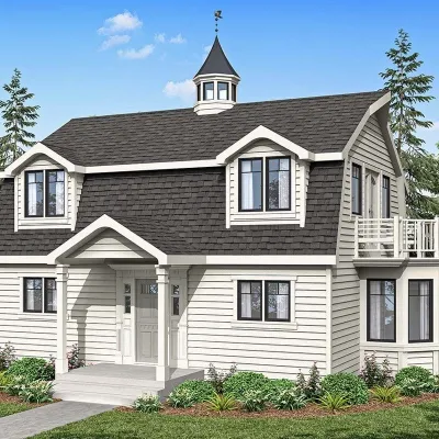 зеркальное отображениеФасад этого дома имеет большие окна и облицован кирпичом. Вальмовая крыша с небольшим уклоном завершает облик этого дома.