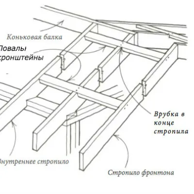 Затем прибейте подпорки из доски 5х10 от верхней обвязки или лаги к коньку с обеих сторон и одну посередине, для усиления. Если эти подпорки нужно будет отпилить разной длины, чтобы они встали под коньком. это означает, что стены, скорее всего, не параллельны и, соответственно, что конек не лежит в горизонтальной плоскости. В этом случае выдернете гвозди из стропильной пары у верхней обвязки со стороны более высокого конца конька и спустите стропила наружу, пока конек не ляжет на подпорку. Небольшой промежуток, который образовался в следствии этого в "птичьем клюве" будет закрыт сайдингом или ветровыми планками.