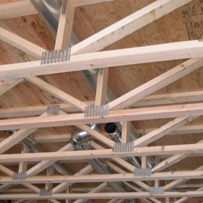 Разделяя пролеты здания, прогоны позволяют использовать лаги меньшего сечения. Чем короче расстояние между несущими стенами, тем меньшего сечения лаги можно использовать, и наоборот, чем больше пролет, тем большего сечения должны быть лаги, чтобы выдерживать вес. Например, если пролет здания или комнаты около б метров, то большинство строительных норм допускают использование лаг сечением 50х300 мм с расстоянием между осями 40 см без использования промежуточных опор. Этот метод может быть необходим для создания перекрытия над подвалом или вторым этажом над большими комнатами или вы можете использовать деревянные двутавровые балки промышленного изготовления. Если вы попытаетесь перекрыть б метров, используя лаги сечением 50х150, то они будут прогибаться посередине. Как бы то ни было, лаги 50х150 могут быть использованы, если есть промежуточные подпорки.