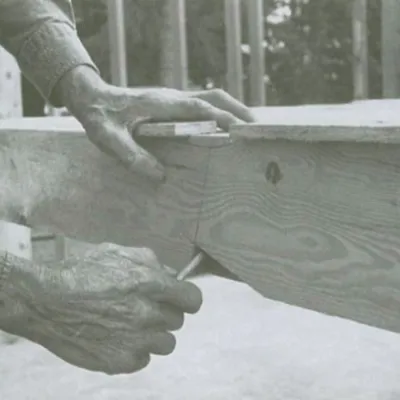 Когда доска не может быть распилена на глаз, плотники используют другой метод. Разметьте доску по длине, затем положите ее на ногу, как показано на рисунке слева, и сделайте распил. При таком способе, действительно не нужно использовать верстак. Доска держится неподвижно одной ногой и одной рукой, позволяя отпиленному концу свободно упасть, не связывая пилу.