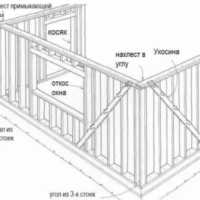 Короткие стены без укосин могут быть временно закреплены вертикально с помощью доски, прибитой поверх стоек.