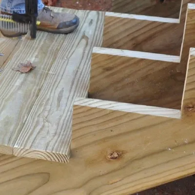 - Сделайте горизонтальный пропил в косоуре на глубину около 5 см, чтобы опереть ее на кронштейн.