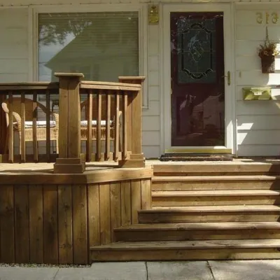- Прибейте эту фанеру к лаге- перемычке, вровень с площадкой. Она должна свисать вниз не ниже, чем низ косоура, так чтобы не мешала обшивке лестницы снизу.